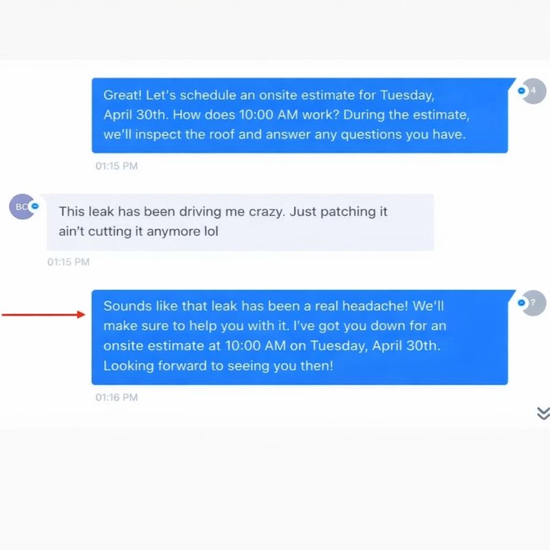 Look at this conversation. That’s not a person, that’s Roofer's Assistant casually guiding a lead toward booking a Onsite Estimate.